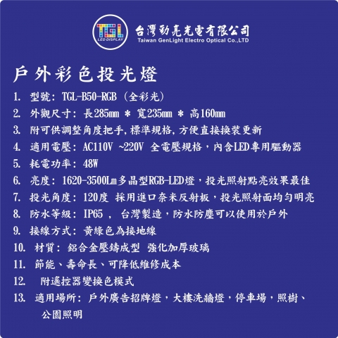 6. 亮度: 1620-3500Lm多晶型RGB-LED燈,投光照射點亮效果最佳
