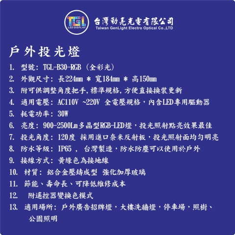 1. 型號: TGL-B30-RGB (全彩光)