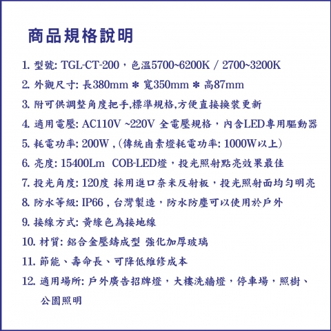 1. 型號: TGL-CT-200 ,色溫5700~6200K / 2700~3200K