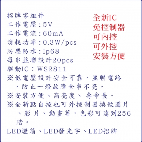 2、LED戶外招牌製作需其它材料:如前述的各板材(可代工製作)、電線(本公司可以提供)、LED招牌專用電源(DC5V,本公司可以提供)。