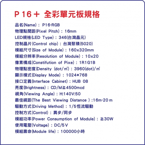 本全彩模組是全彩戶外電視牆之主要組件,因每一點距是16mm,故稱為(P16)+是加強版(10x20)點