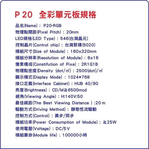 本全彩模組是全彩戶外電視牆之主要組件,因每一點距是20mm,故稱為(P20)