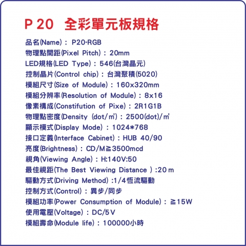 本全彩模組是全彩戶外電視牆之主要組件,因每一點距是20mm,故稱為(P20)