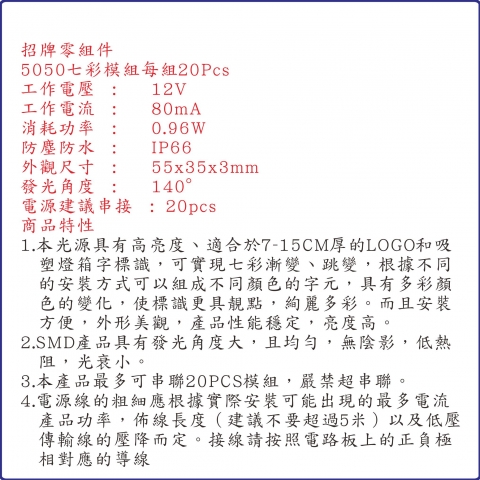 3. 本產品最多可串聯20PCS模組,嚴禁超串聯。