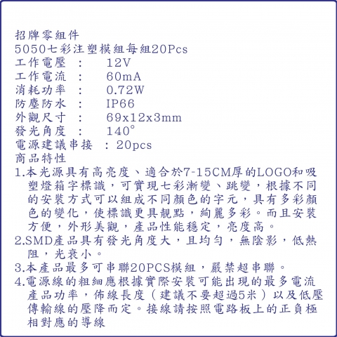 3. 本產品最多可串聯20PCS模組,嚴禁超串聯。