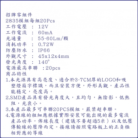 1.本光源具有高亮度、適合於3-7CM厚的LOGO和吸